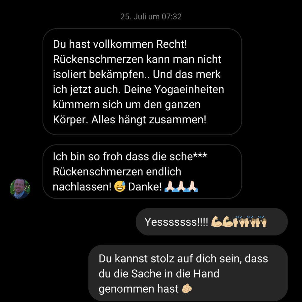 Mir ist es wichtig, dass jeder, der Yoga bei mir lernt, das mit einem guten und sicheren Gefühl tut und auch zu 100% zufrieden ist. Deshalb garantiere ich dir eine Geld-zurück-Option, ohne Kondition, ohne Nennung von Gründen, ohne Diskussion. Schreib mir einfach und ich überweise dir dein Geld zurück.